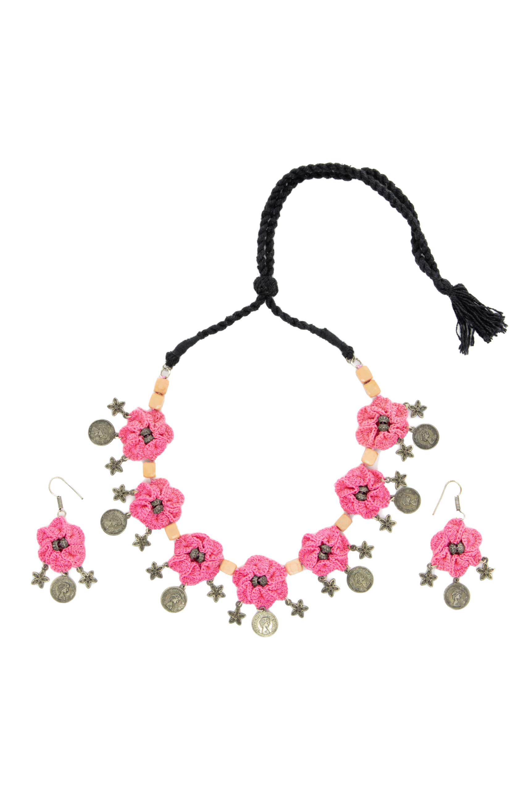 Pink Floral Crochet Necklace Set Handmade