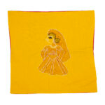 A vivid mustard cushion cover hand-embroidered with a single folk-art female figure in Madhubani style. Its solid color brings warmth, while the figure adds cultural expression.