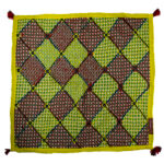 Warm olive and deep brown diamonds, outlined with yellow chain‑stitching, sit on a muted green backdrop. Tiny red corner tassels add charm. Rich, earthy tones create a cozy, rustic look.