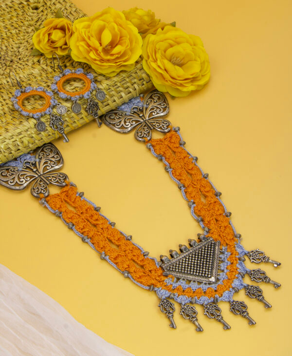 This handcrafted crochet set features a traditional design with vibrant orange crochet beads and German silver pendants. Ideal for cultural events and traditional festivals, this set celebrates folk art in a modern wearable form.