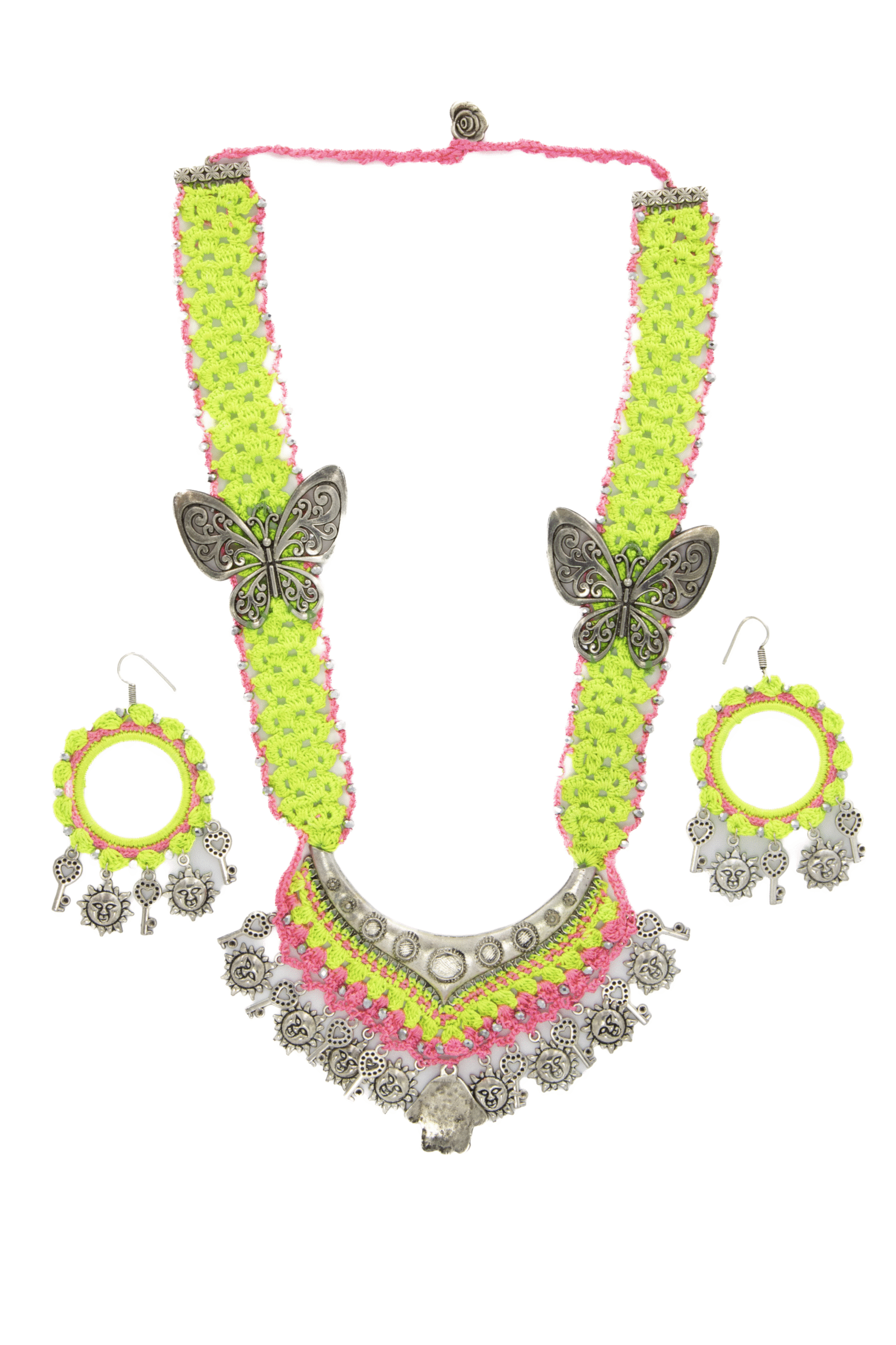Delicately handcrafted, this pink crochet jewelry set brings together gentle charm and intricate detail. The scalloped crochet necklace is interlaced with pearls and features oxidized silver components topped with dainty butterfly-shaped charms, creating a light, breezy aesthetic. The matching earrings mirror the necklace’s charm elements, making it a coordinated and graceful set. Ideal for mehendi functions, springtime gatherings, casual ethnic days, or as a thoughtful gift, this set offers a feminine and festive vibe without being too heavy. Lightweight and visually elegant, it beautifully blends traditional craftsmanship with playful design.