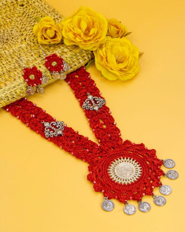 Turn heads with this handcrafted red crochet jewelry set that combines bold color with traditional charm. Featuring a large floral pendant and antique silver finishings, it’s ideal for wedding functions, pujas, or festive events.