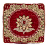 A deep crimson cushion cover adorned with ornate flower motifs in rich gold tones. A centerpiece of luxury and festive charm.