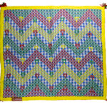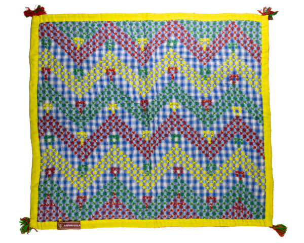 Waves of zigzag motifs in red, green, and yellow cascade across a blue checkered backdrop, all framed by a yellow border. Finished with multicolored tassels in red, green, and yellow at the corners, this vibrant piece evokes energy and movement—ideal for modern ethnic decor.