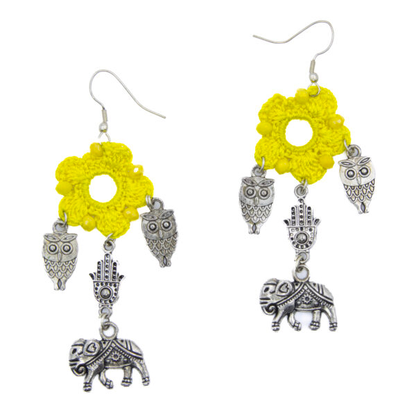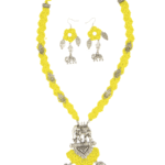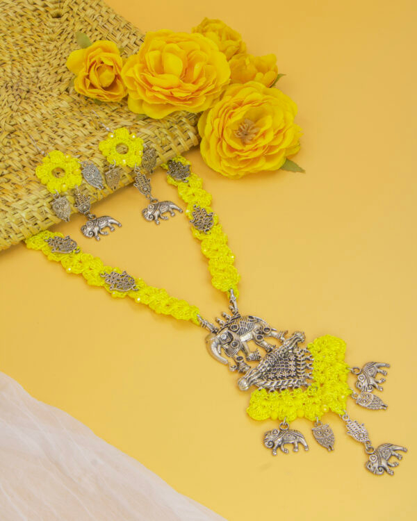 Celebrate heritage craftsmanship with this striking handmade crochet jewelry set in vibrant yellow. The necklace showcases a large tribal-style oxidized silver pendant featuring elephants and tribal motifs, symbolizing wisdom and strength. Adorned with detailed silver charms—owls, elephants, and geometric shapes—the piece combines bold artistry with lightweight comfort. The matching earrings complete the look with floral crochet studs and dangling tribal accents, making it perfect for festive wear, folk performances, or conscious fashion lovers who value culture-rich accessories.
