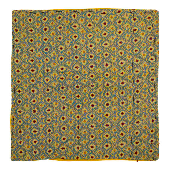 With a mesmerizing floral pattern arranged in a symmetrical grid, this Sujni cushion cover adds energy and brightness to your décor. The repetitive geometric embroidery in yellows and reds is characteristic of traditional North Indian craft.